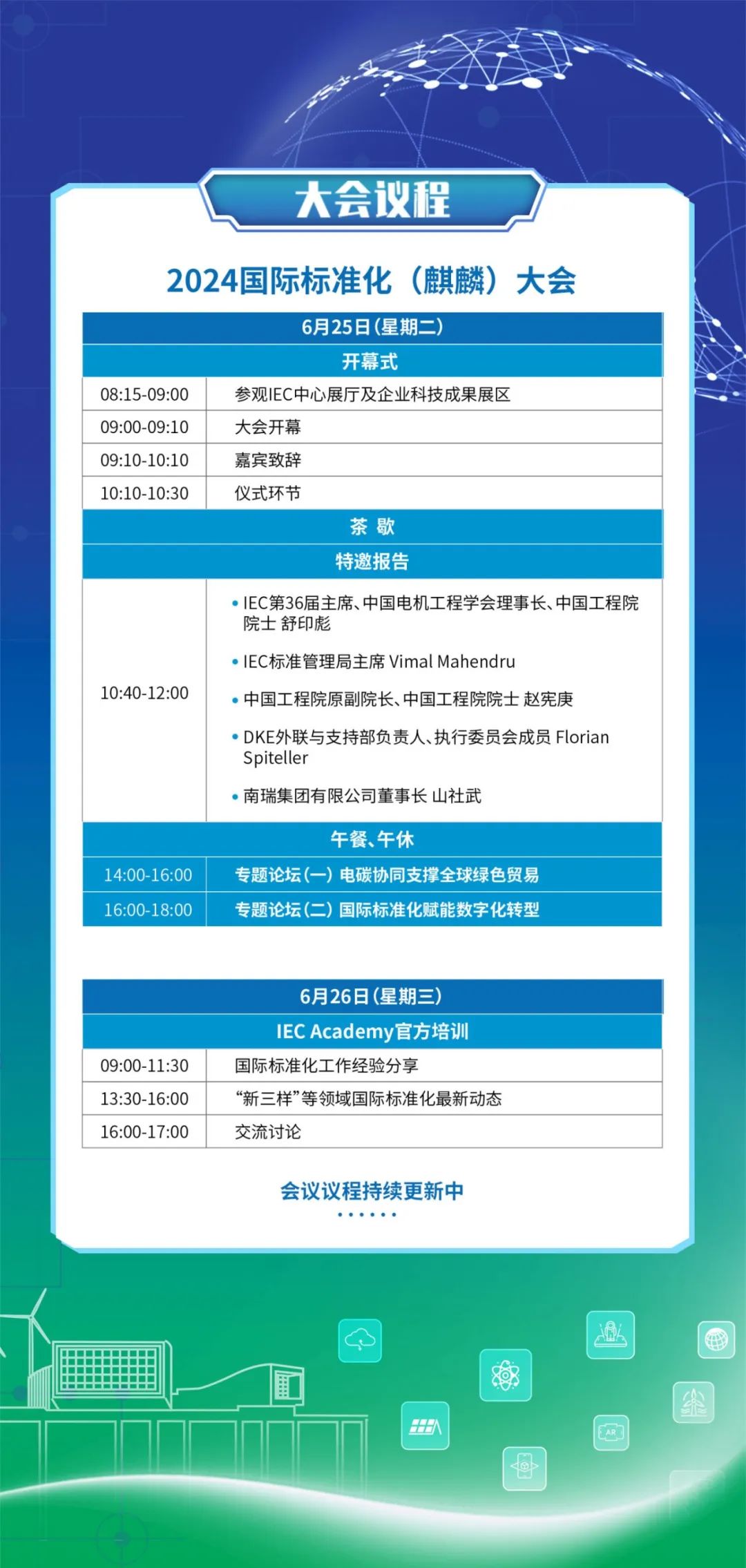 为贯彻落实《国家标准化发展纲要》,以国际标准推动电碳市场深度融合,促进能源电力行业数智化、低碳化协同发展,更好应对全球环境、社会和治理(ESG)挑战,引领全球可持续发展,由南京市人民政府、国家电网有限公司、中国华能集团有限公司、中国电机工程学会主办,IEC等国际标准组织提供联合指导,大会以