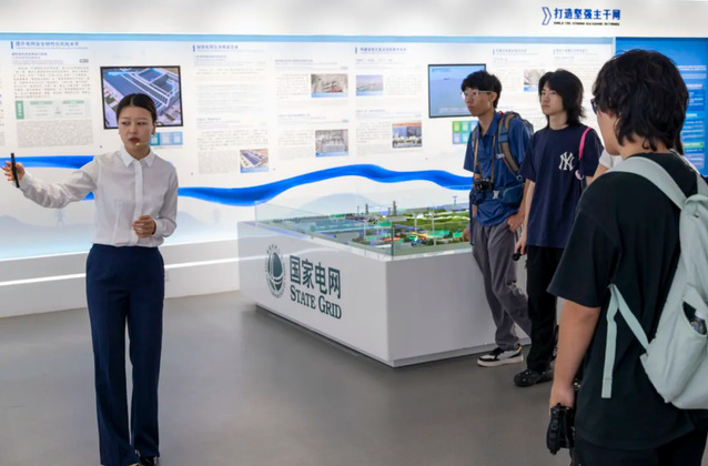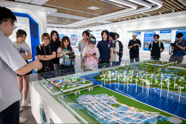 同学们在讲解员引导下参观“打造新型电力系统”主题展厅,讲解员深入浅出地讲解了当前全球能源形势、各国绿色转型路径、我国气候与能源战略、新型电力系统建设要求、江苏落地经验,按照“双碳”-能源-电力的发展脉络、全球-国家-省-企业的逻辑链条,从源、网、荷、储、技术、市场、政策七个方面详细阐述了江苏在新型电力系统建设中的创新实践。参观过程中,各方就新能源发展趋势、储能前沿技术、柔性输电技术等热点问题开展了热烈讨论。