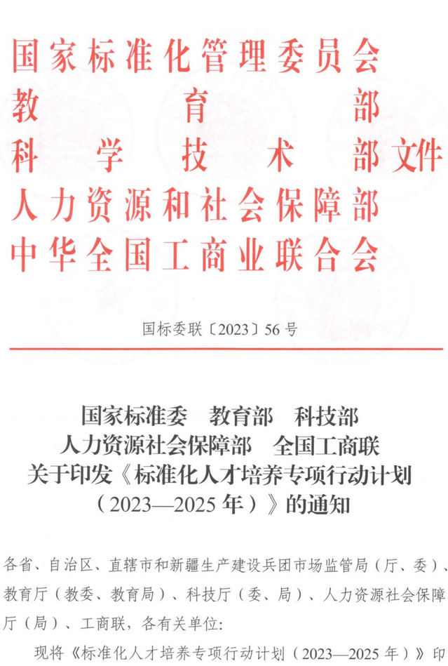 日前,《国家标准委 教育部 科技部 人力资源和社会保障部 全国工商联关于印发〈标准化人才培养专项行动计划(2023—2025年)〉的通知》正式发布。具体内容如下: